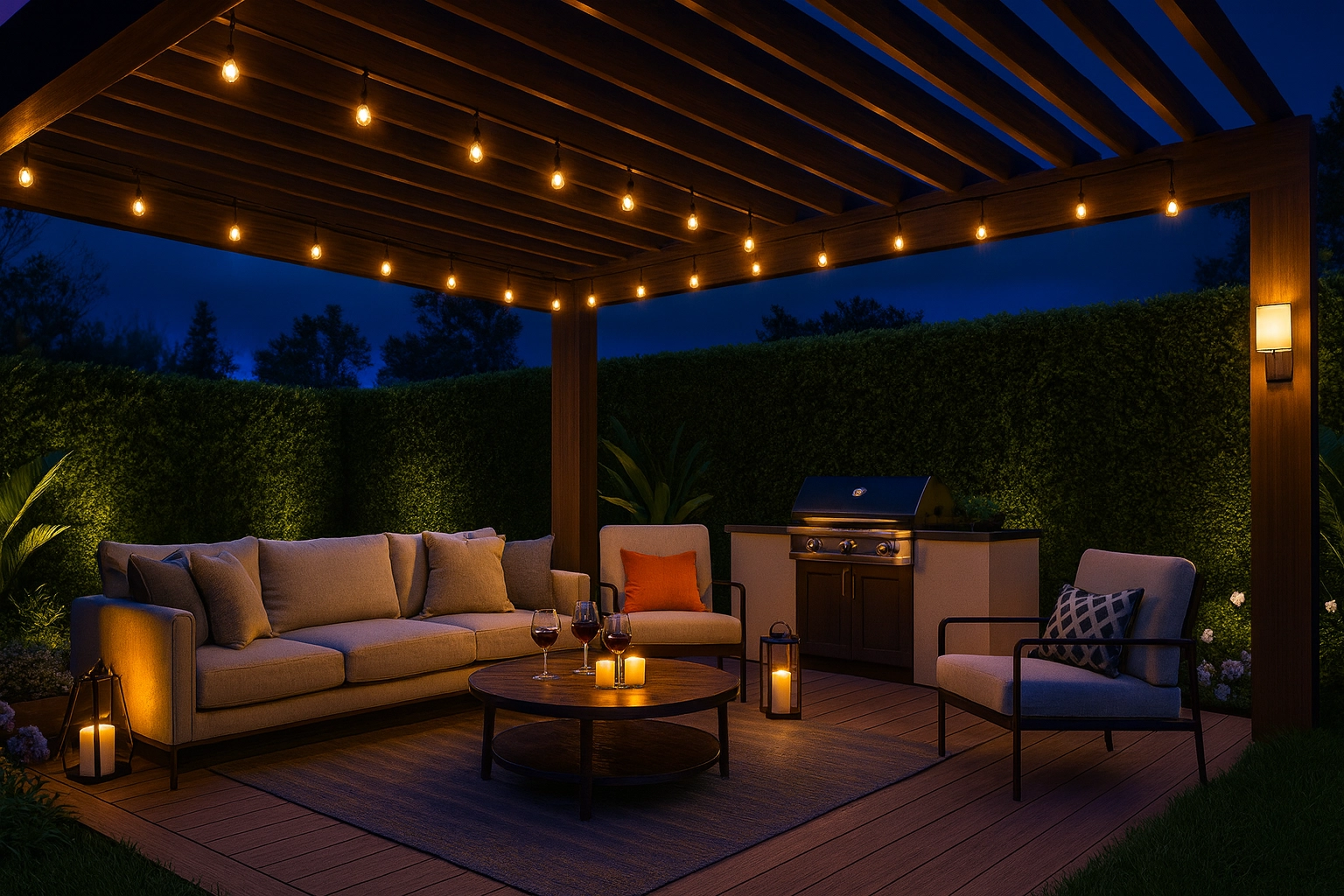 Pergolas, lighting, fire pits, and built-in seating.